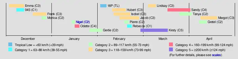 systems | 26 December – 25 April 1985 | 220 km/h (140 mph) | 910 hPa (26.87 inHg) | $40 million | 37 |