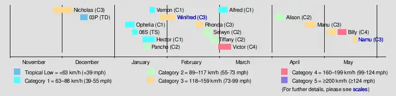 Tropical Cyclone Tiffany occurred from 25 February until 1 March 1986 and remained away from land in the Indian Ocean. Its estimated lowest pressure was 984 hPa.[1]