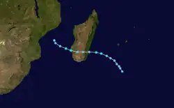 On February 18, a circulation formed in the Mozambique Channel, based on satellite imagery. That day, it developed into Moderate Tropical Storm Gista,[24][25] Early on February 19, the JTWC classified it as Tropical Cyclone 19S.[2] Gista moved generally southward, initially moving to the southeast toward western Madagascar and later curving to the southwest, bringing it within 100 km (60 mi) of the coast. The storm gradually intensified while moving away from the country, reaching peak 10 minute winds of 95 km/h (60 mph) on January 21 about 120 km (75 mi) east of Europa Island. According to the MFR, Gista became extratropical that night, although the JTWC continued tracking it for several more days. According to the JTWC, Gista intensified to the equivalent of a minimal hurricane on February 22 to the southwest of Madagascar, and the next day reached peak 1 minute winds of 160 km/h (100 mph). Gista accelerated to the southeast and dissipated late on February 24 in the westerlies.[24][25]