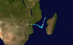On December 23, a tropical depression formed in the Mozambique Channel, accompanied by spiral rainbands toward the center.[7] That day, the system reached peak winds of 65 km/h (40 mph),[8] and the Madagascar Meteorological Service named it Alifredy. The storm moved quickly southeastward toward Madagascar. High pressures to the south prevented much development, and Alifredy moved ashore near Morondava in western Madagascar on December 24 at peak intensity. While crossing the island, the storm weakened into a tropical depression. Alifredy emerged into the open Indian Ocean and failed to restrengthen. It became extratropical and turned southeastward, dissipating on December 27 within the westerlies.[7][8] The JTWC did not track the storm.[2] Alifredy had little impacts on Madagascar; Morombe reported a peak wind gust of 56 km/h (35 mph).[7]