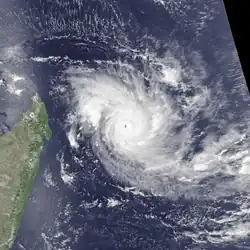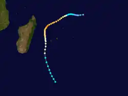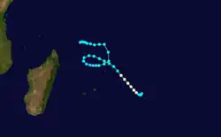 Satellite imagery indicated that a tropical disturbance formed on January 29 to the southwest of Diego Garcia. It moved westward and slowly organized,[16] becoming a moderate tropical storm on January 31.[17] On the same day, the JTWC classified the storm as Tropical Cyclone 13S,[2] and the Mauritius Meteorological Service named it Erinesta. Its track shifted to a slow west-southwest trajectory while intensifying.[16] The JTWC upgraded the storm to the equivalent of a minimal hurricane on February 1, and the MFR upgraded Erinesta to tropical cyclone status on the next day.[17] On February 4, the cyclone attained peak winds, becoming one of the strongest storms in the basin in several decades.[16] The JTWC estimated peak 1 minute winds of 215 km/h (135 mph), and the MFR estimated peak winds of 170 km/h (105 mph).[17] Shortly after Erinesta reached peak intensity, it passed within 20 km (12 mi) of Tromelin Island. The storm curved southward due to an approaching trough, briefly threatening to strike Réunion. However, a ridge built behind the trough, bringing the storm between the east coast of Madagascar and the Mascarene Islands. Erinesta gradually weakened, passing west of Réunion as a severe tropical storm on February 7. The storm accelerated to the south-southeast and later became extratropical, dissipating on February 11 within the westerlies.[16][17]