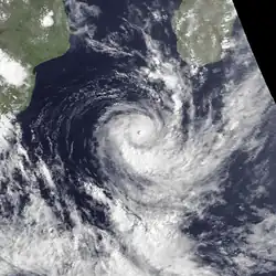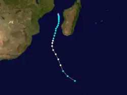 The monsoon was active in early January across the Indian Ocean, spawning what would eventually become Tropical Cyclone Delifina.[5] On January 7, the JTWC classified the system as Tropical Cyclone 04S to the east-southeast Tropical Storm Costa.[2] However, the MFR did not classify it initially due to lack of data. The system had a curved area of convection, and organized enough for MFR to designate it Tropical Storm Delifina on January 10.[14] On the same day, the JTWC upgraded the storm to the equivalent of a minimal hurricane.[15] The storm moved generally southward, after an initial westward movement. Delifina gradually intensified, becoming a tropical cyclone on January 13. By that time, the storm had an eye in the center of deep organized convection. The MFR estimated peak winds of 135 km/h (85 mph), while the JTWC estimated 1 minute winds of 205 km/h (125 mph). Subsequently, Delifina weakened as it progressed southward. After turning to the southeast, the deteriorating storm turned sharply northwestward between two ridges. Delifina turned back to the east and dissipated on January 19 at nearly the same longitude where it formed.[14][15]