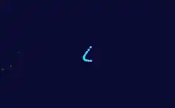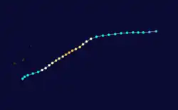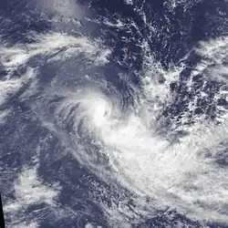 While Honorinina was intensifying and moving toward Madagascar, another system was forming on March 13 south-southeast of Diego Garcia.[31] At 06:00 UTC that day, a tropical storm formed,[32] although it was not named Iarima until the next day.[31] Also on March 13, the JTWC began classifying the storm as Tropical Cyclone 26S.[2] Iarima initially moved southwestward, failing to intensify beyond winds of 65 km/h (40 mph).[32] On March 15, the storm turned and accelerated to the southeast after an anticyclone formed between Iarima and Honorinina. It subsequently weakened, dissipating on March 18 while approaching 90° E.[31][32]