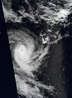 In early February, an area of disturbed weather persisted around Diego Garcia, although lack of satellite imagery made it difficult to track the system at first.[22] On February 6, satellite images indicated that a tropical storm formed,[23] given the name Filomena by the Mauritius Meteorological Service.[22] Also on February 6, the JTWC classified it as Tropical Cyclone 14S.[2] Initially the storm moved to the west, although Filomena turned southeastward into an area of low pressure.[22] The storm never intensified beyond winds of 65 km/h (40 mph) according to the MFR. However, the JTWC estimated 1 minute winds of 100 km/h (60 mph).[23] Filomena gradually weakened as it progress southward. On February 11, the system turned westward and later northwest due to a ridge to the south, having weakened into a tropical depression. Filomena dissipated on the next day.[22][23]