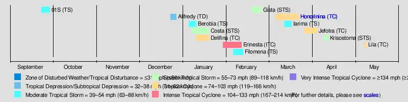 Most of the activity occurred in 1986, with four storms in January, three of which briefly existed simultaneously on January 10. The first of these three, Tropical Storm Berobia, struck eastern Mozambique. Tropical Storm Costa was a series of three tropical depressions within the same broader system that persisted for 12 days, bringing gusty winds and rainfall to the Mascarene Islands. The strongest storm of the season, Erinesta, formed in late January and struck the tiny Tromelin Island, decimating the native rabbit population. Erinesta later produced 1,643 mm (64.7 in) of rainfall in the mountainous peaks of Réunion, one of the highest 24‑hour rainfall totals at the time at Cilaos. Two other storms in February – Filomena and Gista – moved southward for their durations and did not significantly impact land. In March, Cyclone Honorinina killed 99 people and caused $150 million (1986 USD) in damage when it struck eastern Madagascar. There were two other storms in March, Iarima and Jefotra, the latter of which brushed Rodrigues island with gusty winds. The final two storms of the season, Krisostoma and Lila, entered from the Australian basin in April and May, respectively, with Lila exiting the basin to end the season on May 10.