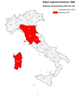 The most relevant result of these elections was the switch of Piedmont, which returned to the Christian Democracy after ten year of leftist administration. If the vote weakened both two major parties, the DC could compensate its loss with the reinforcement of its national allies, while the Communists became increasingly isolated, with Craxi's Socialists looking definitely at their right. Twelve Regional Councils elected a centrist administration, with the PSI rewarded by four presidencies, while the PCI was confined to its traditional strongholds: Emilia-Romagna, Tuscany and Umbria.