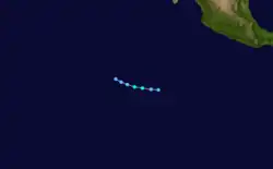 A tropical wave crossed Southwestern Mexico and Belize in mid-August. A tropical disturbance developed from this wave 50 mi (80 km) south of Acapulco on August 15, the same day that the system moved offshore. Moving west-northwest south of an upper-level high, the system was classified as a tropical depression the next day about 125 mi (200 km) south of Manzanillo. Several hours later, the depression reached tropical storm intensity. Turning towards the northwest due to a trough,[2][20] it failed to intensify beyond minimal tropical storm strength.[4] Passing south of the Baja California Peninsula, the storm rapidly moved over cooler waters. Howard weakened into a tropical depression at 0600 UTC August 18. Transversing 75 °F (24 °C) water, Howard dissipated.[2] Rainfall along the southern coast reached 1 in (25 mm) in some places, with totals in excess of 5 in (130 mm) in isolated locations. Further north, rainfall was more scattered. The maximum rainfall was 9.25 in (235 mm) in Reforma, near the southern part of the country.[20]