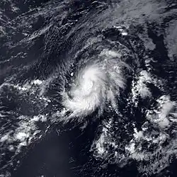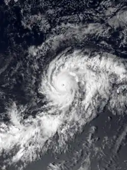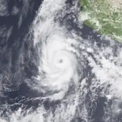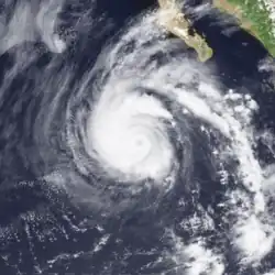 A tropical disturbance developed on September 27 within 250 mi (400 km) of the Mexican coastline.[2] The disturbance was upgraded into Tropical Depression Twenty-Three on 0000 UTC September 28. Tropical Depression Twenty-Three moved west-northwestward, lured poleward by an upper-level trough near northern Mexico. At 0000 UTC September 30, the depression became Tropical Storm Paine, southwest of Acapulco. Roughly 21 hours later, a NOAA Hurricane Hunter flight found winds of 90 mph (140 km/h), upgrading Paine into hurricane. The hurricane peaked as a Category 2 hurricane on October 1 as it turned northwest, headed towards the Gulf of California. Hurricane Paine did not intensify further due to the presence of mid-level wind shear and dry air.[2] The outer eyewall moved across Cabo San Lucas, and the resultant land interaction was believed to have slightly weakened the inner core of the hurricane.[31] Paine moved ashore near San José, Sonora with winds of 100 mph (160 km/h). The storm weakened as it moved over land going through Mexico and then entering the United States. Paine dissipated on October 4 over Lake Michigan.[2][32]