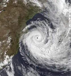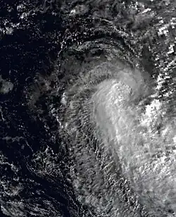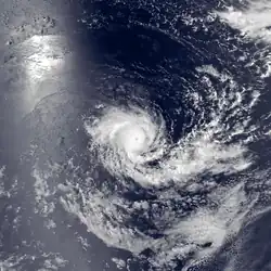 On March 17, the JTWC upgraded Gasitao to the equivalent of a minimal hurricane. On the next day, the MFR upgraded it to tropical cyclone status as the storm slowed and turned to the south and east. The cyclone developed a well-defined eye during this time, surrounded by a powerful central dense overcast. On March 19, the JTWC estimated peak 1 minute winds of 240 km/h (150 mph) while the storm was passing 350 km (220 mi) northeast of Rodrigues. The MFR assessed that Gasitao reached winds of 150 km/h (93 mph) that day before weakening, although the cyclone restrengthened on March 20 to a peak of 170 km/h (110 mph). It accelerated southeastward while gradually weakening.[23][24] On March 23, Gasitao became extratropical,[25] and the remnants dissipated two days later as they were absorbed into the westerlies.[23]