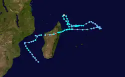 During the season, the Météo-France office (MFR) on Réunion island issued warnings in tropical cyclones within the basin. Using satellite imagery from National Oceanic and Atmospheric Administration, the agency estimated intensity through the Dvorak technique, and warned on tropical cyclones in the region from the coast of Africa to 90° E, south of the equator. The World Meteorological Organization recognized the MFR as a Regional Tropical Cyclone Advisory Centre in 1988, and would later label the agency as a Regional Specialized Meteorological Center in 1993.[1] The Joint Typhoon Warning Center (JTWC), which is a joint United States Navy – United States Air Force task force, also issued tropical cyclone warnings for the southwestern Indian Ocean.[2] The season's nine named storms is equal to the long term average, while the five tropical cyclones – a storm attaining maximum sustained winds of at least 120 km/h (75 mph) – was slightly below average.[3] The MFR considered the tropical cyclone year to begin on August 1 and continue to July 31 of the following year.[1]