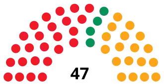 The 47 members of the Cortes of Castilla–La Mancha were elected using the D'Hondt method and a closed list proportional representation, with a threshold of 3 percent of valid votes[b]—which included blank ballots—being applied in each constituency. Parties not reaching the threshold were not taken into consideration for seat distribution. Additionally, the use of the D'Hondt method might result in an effective threshold over three percent, depending on the district magnitude.[2] Seats were allocated to constituencies, corresponding to the provinces of Albacete, Ciudad Real, Cuenca, Guadalajara and Toledo. Each constituency was entitled to an initial minimum of five seats, with the remaining 22 allocated among the constituencies in proportion to their populations.[1][3]