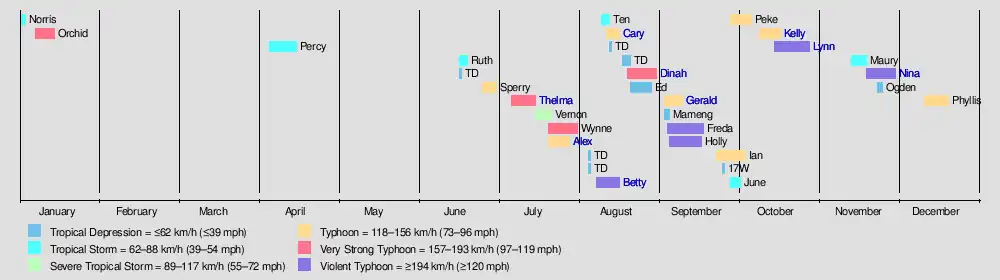 The 1987 Pacific typhoon season was a below average season, though it featured a relatively high amount of typhoons. It had no official bounds; it ran year-round in 1987, but most tropical cyclones formed between June and November.[1] Tropical storms that formed in the entire basin were assigned a name by the Joint Typhoon Warning Center. Tropical depressions that enter or form in the Philippine area of responsibility are assigned a name by the Philippine Atmospheric, Geophysical and Astronomical Services Administration or PAGASA. This can often result in the same storm having two names.