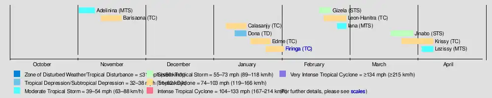 After no activity in December, there were four storms in January, including the most notable of the season – Cyclone Firinga. The storm caused ₣1 billion (1989 francs, $157 million 1989 USD) in damage when it struck Réunion. Tropical Cyclone Calasanjy also formed in the month, causing heavy damage when it struck western Madagascar. Three storms formed in February, the second of which, Hanitra, also crossed from the Australian basin. This storm, as well as later Tropical Cyclone Krisy, were the strongest of the season, attaining peak 10‑minute winds of 150 km/h (93 mph). Tropical Cyclone Jinabo was the first of three storms to form in quick succession in late March, the others being Krisy and Tropical Storm Lezissy. Jinabo originated off the east coast of Madagascar and dropped heavy rainfall on Réunion. Krisy took a similar track and passed within 100 km (62 mi) of Rodrigues and Mauritius, causing heavy crop damage. Lastly, Tropical Storm Lezissy merged with Krisy and dissipated on April 11 to end the season.