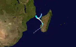 The origins of Calasanjy were from the ITCZ in the Mozambique Channel off the northwest coast of Madagascar in early January.[12] An area of disturbed weather moved southwestward at first, but gradually curved to the northwest. On January 9, the MFR classified it as a tropical disturbance, but upgraded it to Moderate Tropical Storm Calasanjy on the next day.[13] Also on January 10, the JTWC designated the storm as Tropical Cyclone 06S.[2] By that time, Calasanjy was just off the east coast of Mozambique, although it executed a tight loop to the southeast spare a landfall. Moving along its former path, the storm gradually intensified – the JTWC upgraded it to the equivalent of a minimal hurricane on January 12, and the MFR upgraded Calasanjy to tropical cyclone status two days later. Both agencies estimated peak winds of around 135 km/h (84 mph). Later on January 14, Calasanjy made landfall in western Madagascar near Morondava, and soon after moving ashore it turned to the southwest,[13] its motion changed due to a ridge to the southeast.[12] It weakened to tropical depression status before re-emerging into the Mozambique Channel on January 16,[13] becoming extratropical the next day.[12]