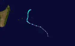 A weak low-pressure area was evident in the Australian basin as early as February 13 between the Cocos Islands and Christmas Island. It meandered for several days, executing a small loop, before beginning a westward motion. After passing south of the Cocos Islands, the system intensified into a tropical storm on February 18 and was named Leon. On the next day, the storm crossed into the south-west Indian Ocean, whereupon the Mauritius Meteorological Service renamed it Hanitra.[25] The storm quickly intensified once it entered the basin.[26] The JTWC, which designated the storm as Tropical Cyclone 11S, upgraded Hanitra to the equivalent of a minimal hurricane late on February 19.[2][26] On February 22, the agency estimated peak 1‑minute winds of 230 km/h (140 mph), by which time Hanitra had begun a steady southwest motion. By contrast, the MFR assessed slower strengthening, only upgrading it to tropical cyclone status on February 23 and estimating peak 10‑minute winds of 150 km/h (93 mph). The storm gradually accelerated to the south and weakened,[26] becoming extratropical over time.[25] The motion shifted to the southeast on February 28, and Hanitra dissipated the next day.[26]