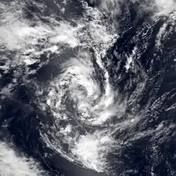 The final storm of the season formed on April 6 to the east-southeast of Diego Garcia while Krisy was active near Rodrigues.[39] That same day, the JTWC classified it as Tropical Cyclone 24S.[2] It quickly intensified into Moderate Tropical Storm Lezissy as it took a westward trajectory, reaching peak winds of 85 km/h (53 mph) by late on April 6.[40] Influenced by a broad area of low pressure, Lezissy turned to the southwest, gradually weakening. It approached former Cyclone Krisy, and the two systems merged by April 11, both losing their circulations and leaving behind a disorganized remnant low.[39]