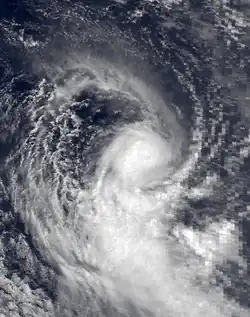 About a week after Jinabo formed, another tropical disturbance formed in the basin on March 28 south of Diego Garcia. In its formative stages, it moved erratically, although generally to the southwest. On March 30, it intensified into Moderate Tropical Storm Krisy,[32] the same day that the JTWC classified it as Tropical Cyclone 21S.[2] Due to a ridge to the south,[33] Krisy's track shifted to the west that day before turning southward on April 1. During that time, the JTWC assessed that Krisy intensified to the equivalent of a minimal hurricane. The MFR upgraded the storm to cyclone status on April 2, and on that day the JTWC estimated peak 1‑minute winds of 195 km/h (121 mph). On April 3, the MFR estimated peak 10‑minute winds of 150 km/h (93 mph) as the cyclone turned to the west-southwest. Over the next few days, the storm slowly weakened,[32] passing 100 km (62 mi) north of Rodrigues on April 5 as a moderate tropical storm.[33] On the next day, Krisy brushed the east coasts of Mauritius and Réunion,[32] passing just 30 km (19 mi) east of the former island.[34] It weakened to tropical depression status on April 7 while curving to the south and later to the east, becoming extratropical. A ridge turned the remnants of Krisy to the north toward Tropical Depression Lezissy, and the two systems merged on April 11.[32][33]