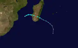 Firinga developed on January 24 well to the northeast of Mauritius. After initially moving to the southeast, it began a southwest motion that it would continue for several days. During that time, the system intensified into Moderate Tropical Storm Firinga, and the JTWC upgraded it to the equivalent of a minimal hurricane on January 28. Early the next day, it intensified to tropical cyclone status, reaching peak winds of 135 km/h (84 mph).[19] Around that time, Firinga passed 50 km (31 mi) west of Mauritius, producing 190 km/h (120 mph) wind gusts.[20] Shortly thereafter, the cyclone struck Réunion, still at peak intensity,[19] producing wind gusts as strong as 216 km/h (134 mph).[20] Firinga turned more to the south as it weakened, degenerating into a tropical disturbance on January 31. It fluctuated in intensity after turning to the southeast and executing a loop to the southwest, dissipating on February 7.[19]