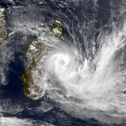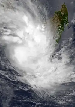 Cyclone Calasanjy caused heavy damage in western Madagascar, with a peak wind gust of 195 km/h (121 mph) in Maintirano.[12][14] The storm caused the Morondava River to increase to a flow rate of 2,702 m3/s (95,420 ft3/s), with a peak height of 4.08 m (13.4 ft) during the storm.[15] Reforms enacted after previous cyclones Kamisy and Honorinina helped facilitate repairs following this storm.[16]