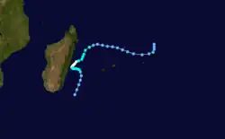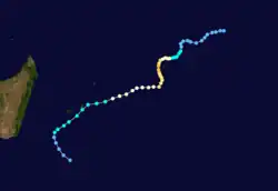 During the season, the Météo-France office (MFR) on Réunion island issued warnings in tropical cyclones within the basin. Using satellite imagery from National Oceanic and Atmospheric Administration, the agency estimated intensity through the Dvorak technique, and warned on tropical cyclones in the region from the coast of Africa to 90° E, south of the equator. At the time, the World Meteorological Organization recognized the MFR as a Regional Tropical Cyclone Advisory Centre, and would later label the agency as a Regional Specialized Meteorological Center in 1993.[1] The Joint Typhoon Warning Center (JTWC), which is a joint United States Navy – United States Air Force task force, also issued tropical cyclone warnings for the southwestern Indian Ocean.[2] The season's 11 named storms is slightly above the long term average, while the five tropical cyclones – a storm attaining maximum sustained winds of at least 120 km/h (75 mph) – was the same as the long term average.[3] There was an ongoing La Niña event in the middle of the season.[4] The MFR considered the tropical cyclone year to begin on August 1 and continue to July 31 of the following year.[1]