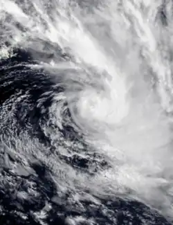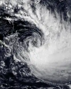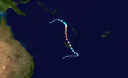 On January 1, Tropical Cyclone Delilah moved into the South Pacific basin from the Australian region, as a category 1 tropical cyclone on the Australian scale.[8] During that day as the system continued to intensify and move south-eastwards towards New Caledonia and the Loyalty Islands, the JTWC initiated advisories on the system and designated it as Tropical Cyclone 04P.[9][10] During January 2, as the system passed about 20–30 mi (30–50 km) of the northeastern coast of New Caledonia, the JTWC and the FMS reported that the system had peaked with sustained windspeeds of 110 km/h (70 mph).[8][10] During the next day Delilah started to weaken and transition into an extra tropical cyclone, as vertical wind shear over the system increased and the upper level westerlies intensified.[1][9] The system subsequently became an extra tropical cyclone during January 4, and started moving southwards towards New Zealand.[1] The system subsequently passed close to northern New Zealand during January 7, before it merged with a cold front during January 8.[1][9]