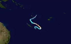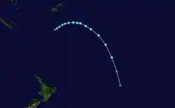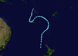 On December 15, the FMS reported that a tropical depression had developed, within the monsoon trough just to the north of Vanuatu.[1][2] The system subsequently persisted for a week with little change in intensity, as it gradually moved south-southwest over Vanuatu and New Caledonia.[2] Between December 20–21, an area of high pressure developed to the south of the system, which prevented any further southwards movement.[1] The system subsequently moved north-eastwards and passed over southern Vanuatu, before the FMS reported late on December 23, that the cyclone had become equivalent to a category 1 tropical cyclone and named it Eseta.[1][2][3] At around this time the system was located about 525 km (325 mi) to the southwest of Nadi, Fiji and had started to move south-westwards as it interacted with a trough of low pressure in the Tasman Sea.[3][4] During December 24, the system intensified further, before the FMS reported later that day that Eseta had peaked with 10-minute sustained wind speeds of 100 km/h (65 mph).[2][4] The system subsequently degenerated into an extratropical depression and impacting New Zealand between December 29–30.[2][5]
