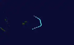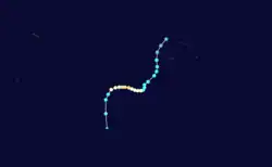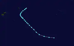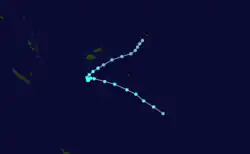 A shallow and ill-defined tropical depression developed on January 1, about 400 km (250 mi) to the east of the Samoan Islands.[1] Over the next few days the depression moved south-westwards before it weakened slightly during January 3, with atmospheric convection surrounding the system decreasing.[1] The system subsequently recurved and started to move towards the southeast towards the island nation of Niue.[2] The FMS subsequently named the system Fili during January 5, after it had become a Category 2 tropical cyclone with peak wind speeds of 95 km/h (60 mph).[1][13] After being named the system continued to move south-eastwards, before it was last noted, well to the southeast of the Cook Islands during January 8.[2][13] There was no damage to any islands associated with Fili, however, the FMS reported that strong winds had appeared to cause some minor damage on Niue.[2]