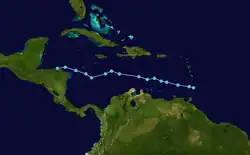 Tropical Depression Six developed from a tropical wave that moved off the northwest African coast on August 12. The system crossed the tropical Atlantic as a wave until it began organizing near 55° W on August 19.[30] The next day this system was designated a tropical depression while it approached the Windward Islands. After crossing the islands, the depression continued westward into the central Caribbean and encountered less-favorable conditions.[31] Though poorly organized on August 21, the depression was expected to strengthen into a tropical storm over the western Caribbean's warmer waters. Nevertheless, it was downgraded to a tropical wave at 80° W near the island of Jamaica on August 23.[32] The disturbance moved over Central America with minimal convection but redeveloped into Hurricane Kristy once it reached the eastern Pacific.[30] The system's main effect on land was squally weather on the Windward Islands.[5]
