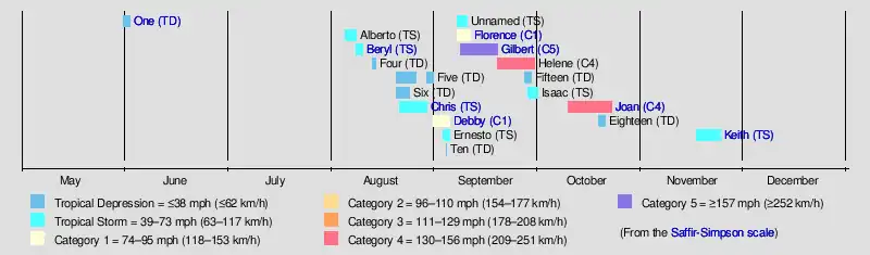 The 1988 Atlantic hurricane season was a near average season that proved costly and deadly, with 15 tropical cyclones directly affecting land. The season officially began on June 1, 1988, and lasted until November 30, 1988, although activity began on May 30 when a tropical depression developed in the Caribbean. The June through November dates conventionally delimit the period of each year when most tropical cyclones form in the Atlantic basin. The first cyclone to attain tropical storm status was Alberto on August 8, nearly a month later than usual.[1] The final storm of the year, Tropical Storm Keith, became extratropical on November 24. The season produced 19 tropical depressions of which 12 attained tropical storm status. One tropical storm was operationally classified as a tropical depression but was reclassified in post-analysis. Five tropical cyclones reached hurricane status of which three became major hurricanes reaching Category 3 on the Saffir–Simpson scale. It was later surpassed 34 years later until the 2022 Atlantic hurricane season, to have multiple Atlantic-Pacific crossover storms.