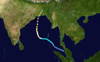 During November 1988, weather patterns over the Bay of Bengal were dominated by the winter monsoon, leading to lower atmospheric pressures over the region and the conglomeration of moisture across the area. The genesis of the 1988 Bangladesh cyclone was preceded by floods that occurred over the Malay Peninsula as a result of a monsoon trough redeveloping over the region.[1][2] By 18:00 UTC on November 21, a low-pressure area within the Strait of Malacca was sufficiently organized such that the Joint Typhoon Warning Center (JTWC) issued a Significant Tropical Weather Advisory; thus, the JTWC began closely monitoring the newly developing storm. Over the next few days, the tropical depression tracked west-northwestward into the Andaman Sea.[nb 1] The inchoate storm quickly organized during this period, and convection about the storm's center intensified. These developments caused satellite intensity estimates to increasingly indicate a stronger storm, which in turn prompted the JTWC to issue a Tropical Cyclone Formation Alert at 18:30 UTC on November 23. At 06:00 UTC the following day, the JTWC upgraded the system to tropical storm status (or modern-day Cyclonic Storm-equivalent) and thus designate the storm as Tropical Cyclone 04B;[1] however, the storm's "best track" listing, which details refined cyclone positions and is subject to revision, indicates that the storm reached tropical storm intensity six hours earlier.[3]