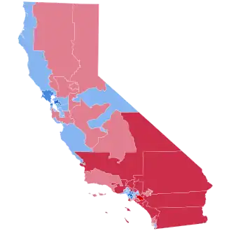 California voted Republican in 1988 for the 9th time out of 10 elections from 1952 on, confirming its status as a Republican electoral bulwark during this period.[5] However, George H. W. Bush won California by only 3.57% even as he won nationally by 7.72%; and Florida displaced it as the state providing the Republican with his biggest raw-vote margin in the nation. Signs of the phenomena that would come to make California a 'Blue Wall' state from 1992 on emerged in this election; for the first time since 1916, Los Angeles County voted for the loser of the national election. Bush was also nearly swept out of the Bay Area, losing populous former Republican strongholds such as Santa Clara, San Mateo, Sonoma, and Marin Counties (as well as Santa Cruz County, the northernmost Central Coast county). While Bush continued to do well in San Diego, Orange, and Ventura Counties (and, to a lesser extent, Santa Barbara, San Luis Obispo, and Monterey Counties, as well as in relatively thinly populated Napa County), this represented a significant erosion of the Republican Party's traditional base along the length of California's coast.[6] By 2016 and 2020, this process was complete, as every coastal county in the state save Del Norte voted Democratic two elections in a row.