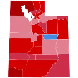 Bush won the election in Utah with a 34-point landslide – his strongest victory in the nation.[2] He carried every county save heavily-unionized Carbon County.[3] This was the fourth election in a row in which Utah gave the Republican nominee his highest vote share of any state in the country. Utah had voted heavily for William Jennings Bryan in 1896 and for Woodrow Wilson and Harry Truman in the two close elections of the first half of the 20th century, 1916 and 1948. However, like most of the rest of the Mountain West, Utah shifted toward the Republican Party in 1952, voting Republican in every subsequent election (as of 2024) save 1964, and voting for Johnson in 1964 by only 9.7%, amid Johnson's 22.6% national landslide.