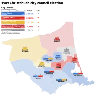 There was deadlock on the city council with a four-way split in its membership. The Labour Party won a plurality of seats with eight seats, the United Citizens won seven, the new Christchurch Action ticket with six seats and the remaining three seats won by independent candidates. Prior to the election there was a schism on the right wing Citizens' Association resulting in two conservative tickets running against each other.[2] Christchurch Action was set up, comprising former councillors from districts that merged with the city as part of the 1989 local government reforms.[3]