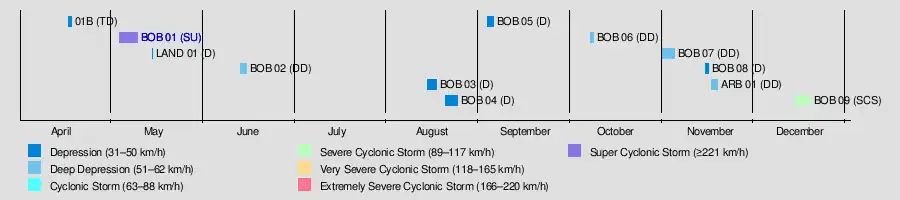 ARB 01 | November 16–18 | Deep Depression | 55 km/h (35 mph) | 1,007 hPa (29.74 inHg) | None | Unknown | Unknown | [9] |
