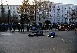 On 2 September, the situation becomes violent when demonstrations organized by the People's Front of Georgia and the NDP to ask for Jaba Ioseliani's freedom were dispersed by MIA forces.[27] According to the non-government organization Human Rights Watch, the protesters, assembled on Rustaveli Avenue, were beaten with batons, while soldiers shot at the crowd. The incident resulted in three civilians getting injured.[27]
