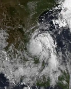 A tropical wave emerged off the coast of Africa on June 20, and no significant development occurred until it became Tropical Depression Two in the western Gulf of Mexico on July 5.[16][17] On its first advisory, a tropical storm watch was issued for from Baffin Bay, Texas, southward to Tampico, Tamaulipas.[18] Nearing the coast of Mexico, the depression attained its peak intensity with winds of 35 mph (56 km/h) and a minimum pressure of 1,007 mbar (29.7 inHg). Failing to intensify further, Tropical Depression Two made landfall near La Pesca, Tamaulipas, on July 6.[19] The National Hurricane Center issued the final advisory on July 7,[20] although the circulation persisted until July 9 southwest of Texas.[16] The depression had only minor impacts in Mexico and Texas, other than rainfall. Precipitation was heaviest in the state of San Luis Potosí, where the rainfall peaked at 17.47 in (444 mm) in Tamazunchale.[16]