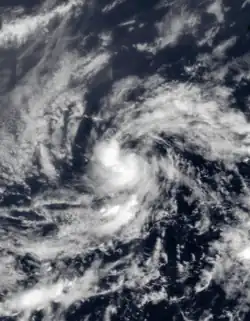 Upon becoming a tropical storm, only slow strengthening was forecast, due to the presence of an upper-level trough to its west.[51] The storm ultimately reached peak winds of 50 mph (80 km/h), which it maintained for about 36 hours. On September 10 it attained its organizational maximum after developing a central dense overcast. Later that day, an upper-level low increased wind shear over the storm,[49] which exposed the circulation from the deep convection.[52] As Danny approached the Lesser Antilles, it weakened to tropical depression status on September 11. Later that day, a Hurricane Hunters flight was unable to locate a closed circulation, which indicated that Danny degenerated into a tropical wave about 150 mi (240 km) east of the Lesser Antilles. The remnants tracked to the northwest and later to the north before being absorbed by a frontal system.[49]