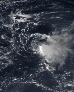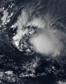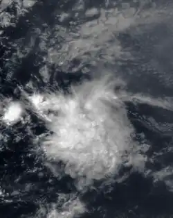 A tropical wave moved off the coast of Africa on October 19. Moving westward, it developed a weak circulation on October 23.[70] Despite the presence of strong shear, the system was upgraded to a tropical depression at 2200 UTC on October 24 about 1,100 miles (1,800 km) east of the Lesser Antilles.[71] This was based on a rating of 1.5 on the Dvorak technique, which is a method of estimating the intensity of tropical cyclones via satellite.[70] At the time of development, the depression had a small area of convection near and east of the center, and due to the wind shear it was never expected to intensify.[71] By October 25, the circulation had become dissociated from the convection.[72] The depression dissipated soon after without affecting land.[73]
