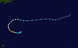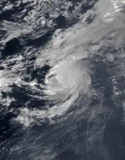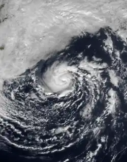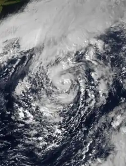 On October 23 a mid-level low formed south of Bermuda. By two days later it had become a surface low, and on October 26 it developed into a subtropical storm. The system was labeled as such due to the initial lack of deep convection over the center, although following an increase in thunderstorms the NHC reclassified it as Tropical Storm Grace late on October 27. By that time, the storm had executed a path generally to the northwest.[74] Grace continued to intensify and organize, and based on Hurricane Hunter reports the storm was upgraded to a hurricane early on October 28.[75] Shortly thereafter, Grace turned sharply to the east due to the influence of a rapidly intensifying extratropical cyclone off the New England coast.[76] An eye developed in the center of Grace, despite shallow convection.[77]