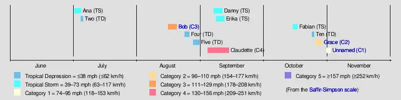 The most significant storm of the season was Hurricane Bob, which at the time was among the ten costliest United States hurricanes. After brushing the Outer Banks of North Carolina and Long Island in New York, the hurricane made landfall on Rhode Island. It caused $1.5 billion in damage (1991 USD), mostly in Massachusetts, and 17 fatalities. The strongest hurricane of the season was Claudette, which reached peak winds of 130 mph (210 km/h) near Bermuda. It passed near the island but did not cause any damage. Fabian was the only tropical storm to move over or near Cuba or Florida, producing heavy rainfall but no damage. Hurricane Grace, the final named storm of the season, provided the energy that led to the development of a powerful nor'easter known as the Perfect Storm. Originating from an extratropical storm, the Perfect Storm intensified while moving westward toward New England, leaving $200 million in damage and causing coastal damage from Puerto Rico to Florida and northward through Canada. It later transitioned into a hurricane over the Gulf Stream, finally dissipating over Nova Scotia on November 2.
