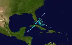 The origins of Fabian were from a tropical wave and a cold front that entered the northwestern Caribbean Sea on October 12, which produced an area of thunderstorms in the Gulf of Honduras.[59] At 1300 UTC on October 15, a Hurricane Hunters flight observed sustained winds of 40 mph (64 km/h) to the southwest of the Isle of Youth. Based on the report, the NHC designated the system as Tropical Storm Fabian.[59][60] although the NHC later assessed that the system developed as a tropical depression earlier that day.[61] With a high pressure area to the north, there was already a large pressure gradient that had produced tropical storm force winds over the area.[62] Initially the storm was disorganized,[59] with its strongest winds located primarily east of the center.[63] An eastward-moving upper-level trough imparted a northeast motion as well as unfavorable wind shear.[60] After reaching peak winds of 45 mph (72 km/h), Fabian crossed the Isle of Youth before crossing western Cuba.[59] By early on October 16, the center was becoming difficult to locate as Fabian moved through the Florida Straits.[64] The storm later moved through the Bahamas and became extratropical as it interacted with an approaching front.[59]