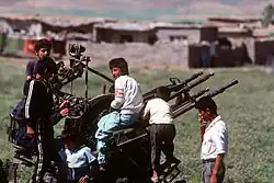 There were several reports of chemical warfare attacks, including of a nerve agent being used during the assault on Basra. Following an investigation, the United Nations (UN) found that there was no evidence that Iraq used chemical weapons to repress the uprisings, but did not rule out the possibility that Iraq could have used phosgene gas which would not have been detectable after the attack.[25] According to the U.S. government's Iraq Survey Group, Iraqi military did in fact use the nerve agent sarin, as well as non-lethal CS gas, on a massive scale when "dozens" of improvised helicopter bombing sorties were flown against rebels in Karbala and the surrounding areas in March 1991; evidence of apparent mustard gas attacks have been also reported in the areas of Najaf and Karbala by the U.S. forces that have been stationed there at the time.[30]