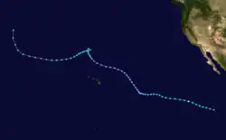 Enrique steadily intensified and by early on July 16, the National Hurricane Center was anticipating for the system to reach hurricane intensity.[16] Continuing to strengthen, it reached hurricane status On July 17. However, this was for a short period of time as it developed an eye. Due to uncertainty in the storm's intensity that day, it is possible that it could have been a hurricane earlier than originally estimated.[14] Wind shear associated with a trough and passage over cooler waters caused Enrique to begin weakening and the cyclone's center soon became exposed. Enrique was downgraded to a depression on July 19 and the weakening cyclone crossed into the central Pacific on July 20.[14][17] The system persisted drifting northwestward for several days, while maintaining a well-defined, albeit weak, center of circulation.[18][19] On July 27, after it passed well to the north of the Hawaiian Islands, Enrique managed to briefly re-intensify to tropical storm status, attaining a secondary peak intensity of 50 mph (85 km/h), while completing a clockwise loop.[18][20] As Enrique headed toward the Midway Island, increased wind shear weakened the system, causing another downgrade to depression status.[18][20] As the storm approached the International Dateline, the system started to restrengthen. Shortly after crossing the dateline, Enrique became a tropical storm again on August 1. It lasted for less than 24 hours before it lost its convection and thus the cyclone began to dissipate.[20] No damages or casualties were caused by Enrique.[17][19][20]