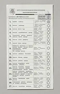 Parliamentary elections were held in Lithuania in two stages on 25 October and 15 November 1992.[1] A total of 141 members were elected to the Seimas, which replaced the Supreme Council; 70 were elected using proportional representation and 71 from single-member constituencies. Where no candidate in the single-member constituencies received more than 50% of the vote on 25 October, a run-off was held on 15 November. The first round of the elections were held simultaneously with a referendum on the adoption of a new constitution.