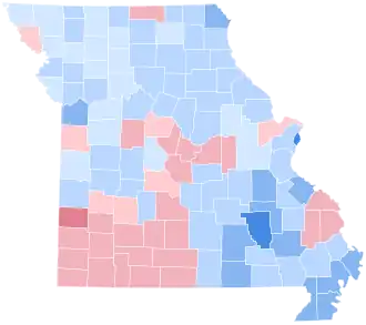 As of the 2024 presidential election, this remains the last time that Morgan, Dallas, Howell, Harrison, Adair, Andrew, Johnson, Butler, Atchison, Phelps, Platte, Maries, Stoddard, Pulaski, Dent, Texas, and Carter Counties have voted for a Democratic presidential candidate.[4] It was also the last time that a Democrat carried the state by double digits, the last double-digit win for any candidate until 2016, the last time that Missouri has voted to the left of neighboring Iowa, and the last time that the state voted more Democratic than the nation as a whole, weighing in at about 4 points more Democratic.