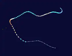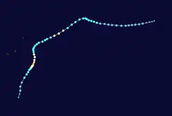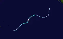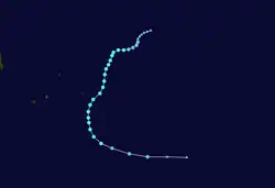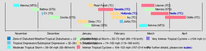 During the year, there were neutral El Niño Southern Oscillation conditions, and for several months there was a well-established monsoon trough that extended into the Australian basin.[5] The average storm duration was 9 days, although the final storm, Odille, lasted 16 days, a record at the time.[4] The season was the second-most active on record since the start of reliable satellite coverage in 1967. Due to the high number of storms, there were a record number of cyclone days – days in which a tropical cyclone is active – as well as intense tropical cyclone days, with a total of 27 days for the latter. The next seasons to approach either total were the 2001–02 and 2018–19 seasons.[6] MFR had an alphabetically prepared list of names for the season, the last seven of which went unused: Pemma, Ronna, Sydna, Telia, Valentina, Williana, and Yvanna.[7]