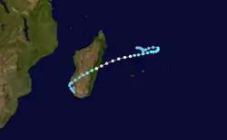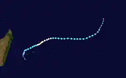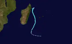 In late February, a low-pressure area developed near the Cocos Islands,[4] associated with the monsoon trough. After initially moving eastward, a ridge turned it to the west,[30] and on March 7, the system crossed 90° E into the south-west Indian Ocean as a developing tropical depression. The next day, MFR upgraded it to Tropical Storm Litanne. For much of its track, Litanne moved generally to the west-southwest, to the north of a large ridge. The storm quickly intensified, developing an eye feature within its central dense overcast by late on March 8. Late on March 9, MFR upgraded Litanne to a tropical cyclone, after the storm developed a small, well-defined eye 20 km (12 mi) in diameter.[4] With warm sea surface temperatures, Litanne intensified into an intense tropical cyclone by late on March 10, although it subsequently weakened slightly. The cyclone turned to the southwest due to a trough from the remnants of Kelvina. Around 2000 UTC on March 12, Litanne passed near St. Brandon, and the next day the cyclone passed about 300 km (190 mi) north of Réunion island. At the time, the storm's eye was 40 km (25 mi) wide, and the wind radius was about 175 km (109 mi) wide. The islands reported high surf but little effects. Subsequently, the storm turned more to the west, and Litanne restrengthened into an intense tropical cyclone while approaching the eastern coastline of Madagascar.[4] MFR estimated peak winds of 195 km/h (120 mph) on March 14.[31]