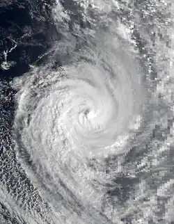 After passing near Rodrigues, Ivy strengthened further, developing a well-defined eye 50 km (31 mi) in diameter, while turning more to the south due to a trough associated with the remnants of Hollanda.[4] The JTWC estimated peak winds of 185 km/h (115 mph) on February 17, around the same time MFR estimated peak winds of 140 km/h (85 mph).[27] The strengthening ridge caused Ivy to slow its motion to the southwest while increased shear caused weakening.[4] On February 18, the cyclone weakened to tropical storm status, and by the next day was downgraded to tropical depression status. On February 20, Ivy became extratropical, which dissipated the subsequent day.[27]