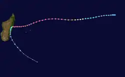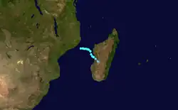 Cyclone Geralda originated from an area of low pressure from the monsoon trough on January 25. Over the following few days, the depression underwent gradual intensification, and MFR estimated peak winds of 200 km/h (125 mph) on January 31. Cyclone Geralda made landfall near Toamasina, Madagascar after weakening from its peak intensity. Within hours of moving onshore, the system had substantially weakened, and by February 5, Geralda had degenerated into a land depression. After briefly emerging into the Mozambique Channel, Geralda crossed southern Madagascar, and it became extratropical on February 8.[4] Geralda was the strongest of the season and the strongest to hit Madagascar since a cyclone in March 1927.[4][17]
