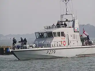 On 29 March a flotilla of 36 French trawlers steamed up to Saint Peter Port in Guernsey, where a preliminary deal was agreed.[2] After the first incidents, the Royal Navy deployed unarmed Royal Marines to conduct any future similar law enforcement operations. The marines were from 40 Commando, based at Taunton in Somerset. La Calypso was eventually caught by the fishery vessel HMS Jersey and her master was put under arrest in Guernsey on 2 April 1993.[5] The skipper, Michel Mesnage, was released on bail on 3 April.[6] A new incident took place on 30 June 1993, when the Guernsey-based trawler Sara P was seized by the French Navy, and had her pots confiscated.[4]